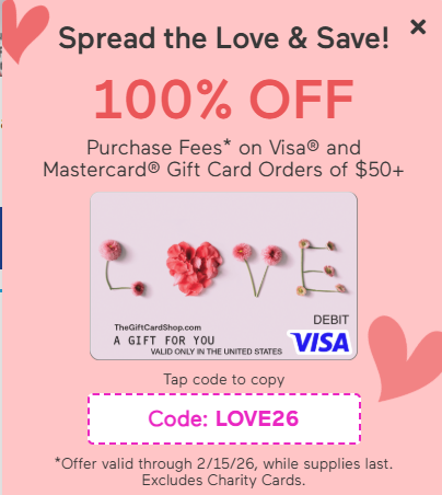100% off purchase fees on Visa gift card orders of $50 or more with promo code: LOVE26