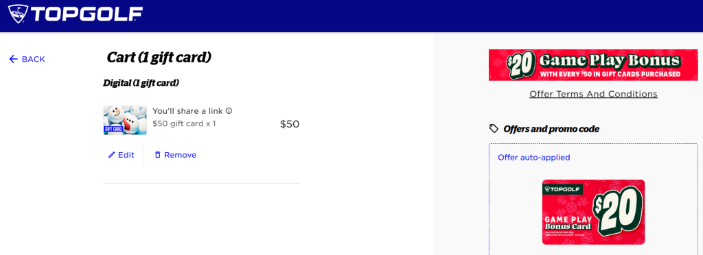 Get a $20 Game Play Bonus Card for every $50 in Topgolf gift cards purchased. All Bonus Cards will be sent to the purchaser’s email address.