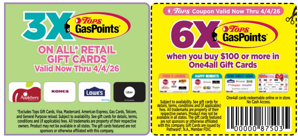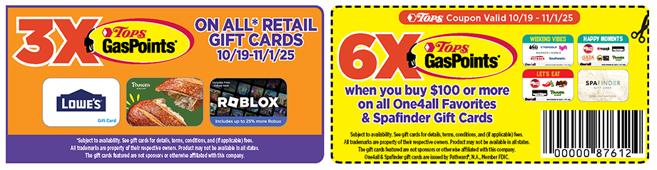 Get 6X gas points on $100 or more One4All favorites & Spafinder gift cards and 3x on all retail gift card purchases