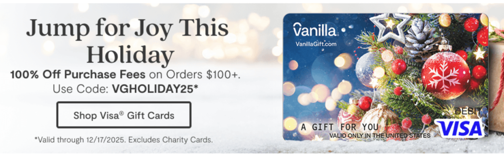 Get 100% off purchase fees on the purchase of $100+ Visa gift cards with promo code VGHOLIDAY25