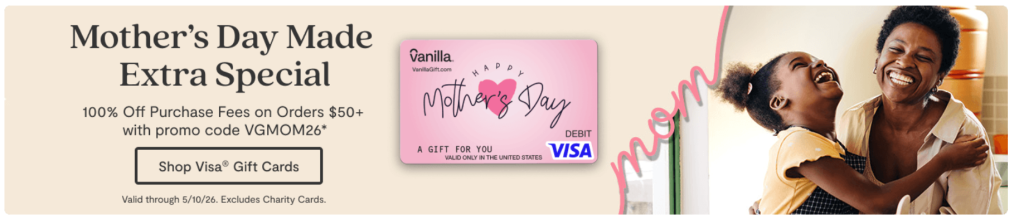 Get 100% off purchase fees on the purchase of $50+ Visa gift cards with promo code VGMOM26