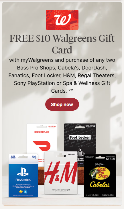 [EXPIRED] Walgreens: Buy Any 2 Bass Pro Shops, Cabela’s, DoorDash, Fanatics, Foot Locker, H&M, Regal, PlayStation or Spa Week and Get a $10 Walgreens Gift Card Free