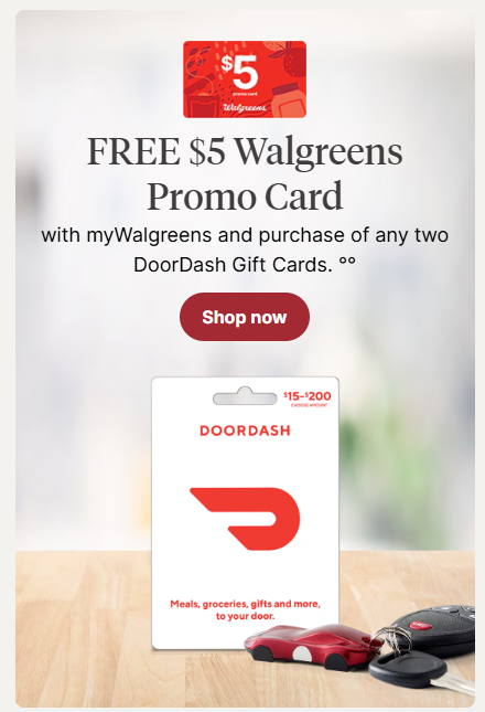 Buy any two of the following gift cards and get $5 Walgreens promo card free: