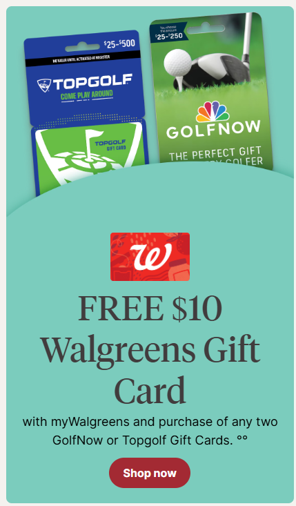 Buy any two of the following gift cards and get $10 Walgreens gift card free: