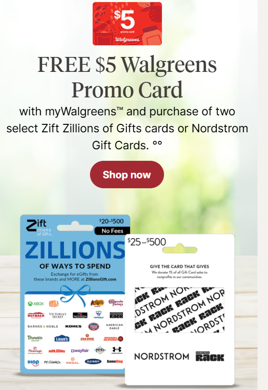Buy any two of the following gift cards and get $5 Walgreens promo card free: