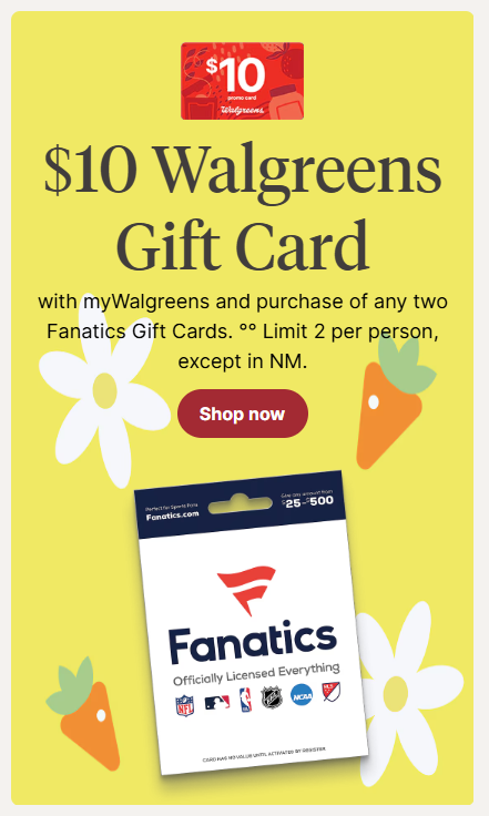 - Buy any two of the following gift cards and get $5 Walgreens gift card free: