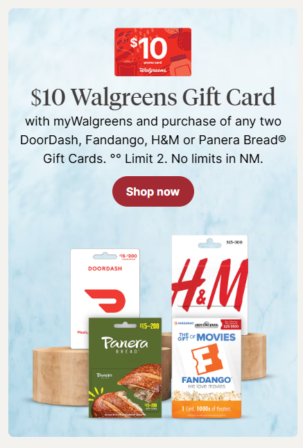 Walgreens: Buy Any Two H&M, DoorDash, Fandango or Panera Gift Cards and Get a $10 Walgreens Gift Card Free