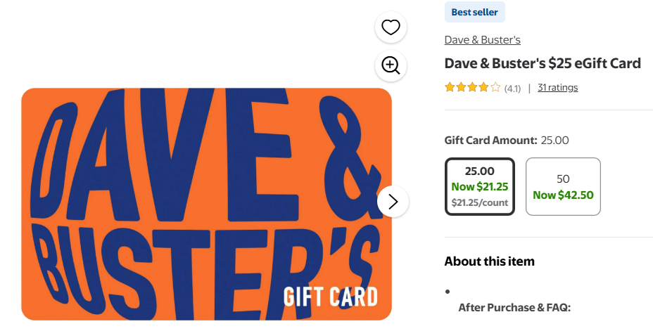 15% off $25 and $50 Dave & Buster’s eGift Card