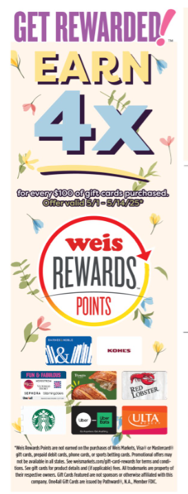 Earn 4x Weis Reward Points for every $100 spent on the following gift card purchases: