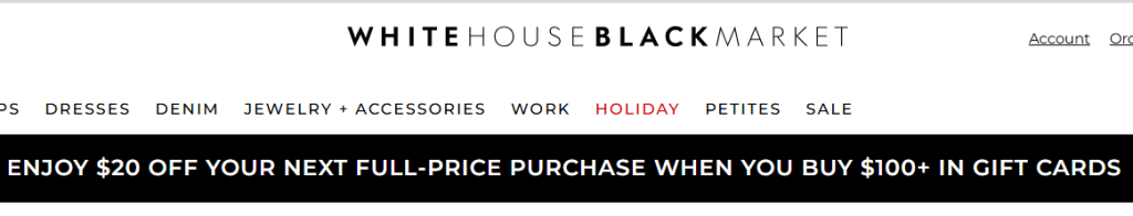Purchase $100.00+ in White House Black Market gift cards (including e-gift cards) in a single transaction and receive one (1) $20 off a full-priced purchase coupon.